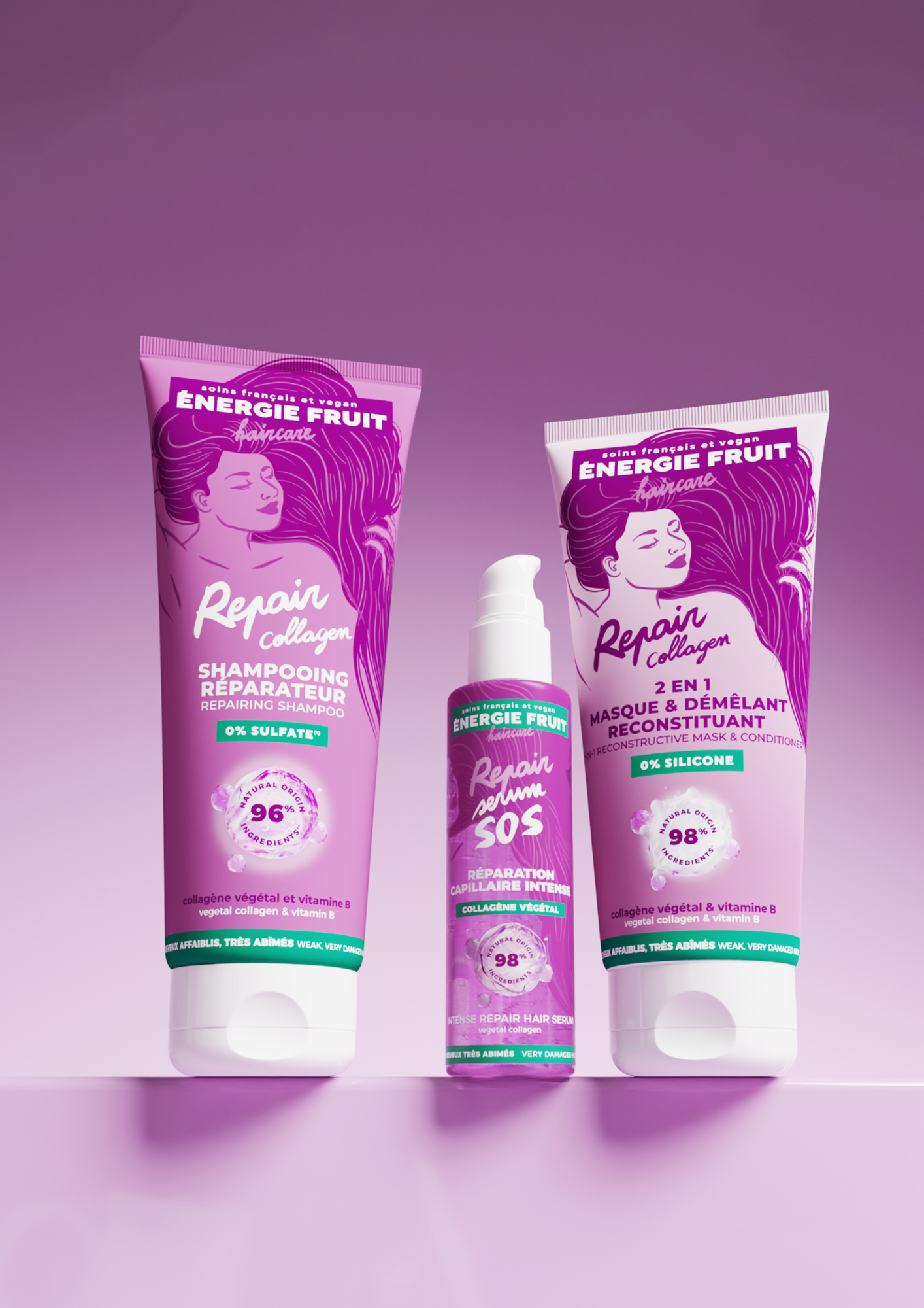 Une chevelure réparée même sur les pointes les plus endommagées, au Collagène végétal et vitamine B pour ne plus avoir à les couper !