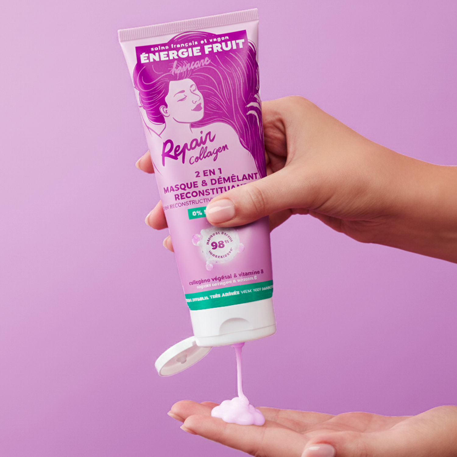 - Le Masque 2EN1 Regénérant, riche en collagène végétal et vitamine B, nourrit, répare et fortifie la fibre en profondeur.